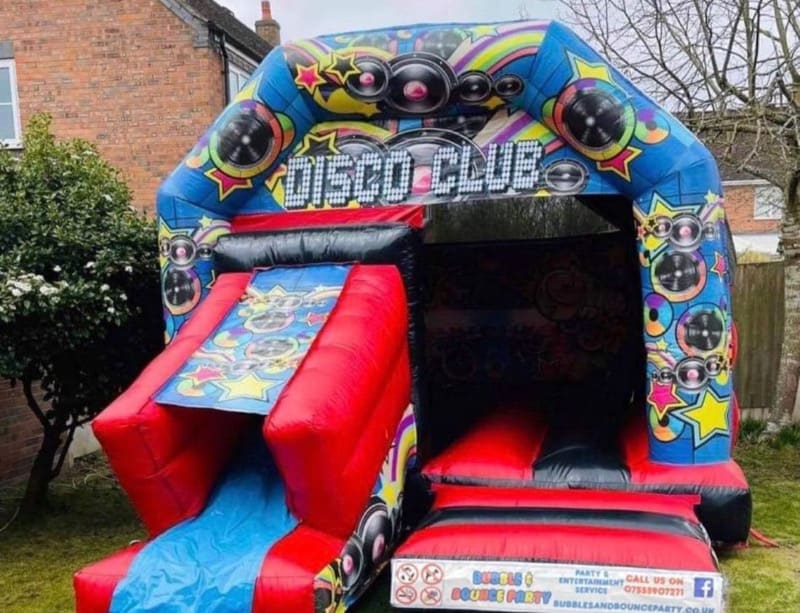 Pictured is our Disco Club themed childrens castle which fits comfortably in most gardens. This is one of our most popular castles and is a great hit at all parties.